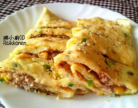 - 4. 把蛋饼皮覆盖上去,在饼皮上加少许油