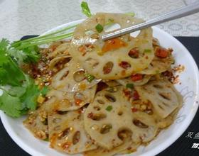 炒好的酱料碗中调入酱油、凉拌醋、自制辣椒油,加葱花淋在莲藕上,搅拌均匀即可。