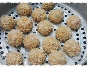 左手拿起沾好糯米的丸子,右手拿张防沾纸埝在丸子下方放入蒸笼。