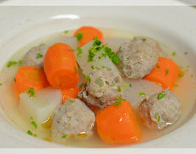 - 2. 将煮丸子水倒入另一汤锅中滚沸,加入姜片、切成跟丸子大小相近的红白萝卜块后煮至水滚,改转中小火续煮10-15分钟。加入芹菜丸子待水再度滚开后加入盐巴调味,起锅前洒上白胡椒粉、淋点香油即完成。