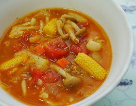 - 1. 牛番茄去皮切成块、洋葱、红萝卜切成小丁、白花菜切小株、马铃薯切中丁、玉米笋切小段、高丽菜、海鲜菇、雪白菇皆剥成小块备用。