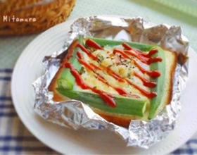 放在铝箔纸上,把吐司的四角上微微覆盖住(以免烤焦)。