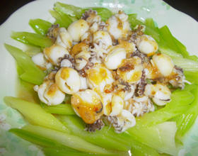 热锅,倒入少许油爆炒蒜末~西洋芹~加少许盐调味,熟后先铲出摆入盘中,利用锅子再倒入XO酱~墨鱼,米酒呛锅,拌炒一下即可起锅,铺在西洋芹上就OK啰~^^