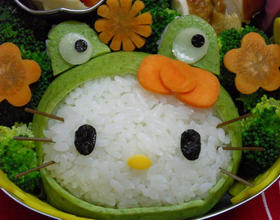 - 3. 把kitty放到便当盒中,再把准备好的便当菜放入,最后用熟的花椰菜和胡萝卜花补满空隙,就完成可爱的「青蛙kitty」啰!
