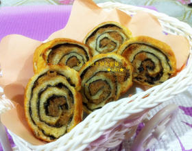 在面包上涂上少许牛油,紫菜放在面包上,再铺上肉丝,慢慢把它卷起来《我用了两片面包顺序的卷》,要轻轻的卷,不要把面包压扁。