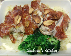 利用鸡皮煎出来的油爆香蒜片,捞出放凉.