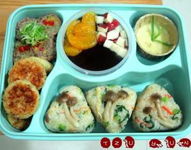 - 3. 准备一些滚水撒一点盐巴,将油菜烫熟,取出后稍微冷却切小丁或切碎,和蒸好的饭拌匀,试吃一下,可以再加一点点盐巴调整,之后捏成饭团即可。
