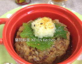 - 7. 汉堡肉装入盘内淋上6、紫苏、白萝卜泥放上即可