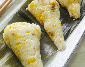 两边往中间折再把粽叶长端扣过来用棉绳绑住