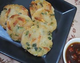 莲藕磨成泥,加入姜泥、葱花、樱花虾拌匀。