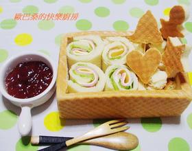 生菜酌量ˊ沙拉酱ˊ番茄酱酌量[沾酱]果酱酌量。 - 9. 取出的面包分为3层ˊ其中2层加入[馅料]做成圆筒面包ˊ