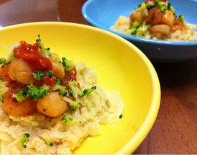 最后将薯泥铺底放上甘贝淋上番茄洋葱酱及花椰菜末即可!