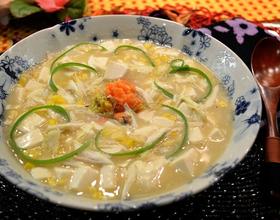- 7. 加入豆腐丁和玉米粒大火煮2分钟,加入蟹肉煮沸。