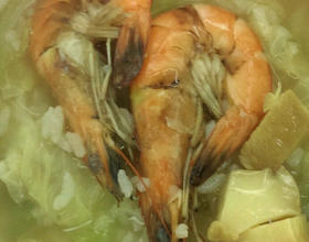 白饭加水煮成粥,高丽菜切丝加入,加入鲜虾