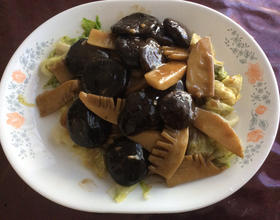 - 2. 起油锅,爆香蒜末,加入冬菇、冬笋,略炒后加入一碗泡冬菇的水,适量酱油、蚝油、糖、胡椒粉调味,盖上盖略焖一会儿,用糯米粉水勾芡,起锅前淋些麻油。