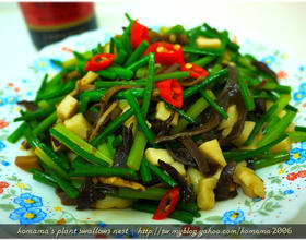 翻炒片刻后,再放入靠近尾端的韭菜一同拌炒。