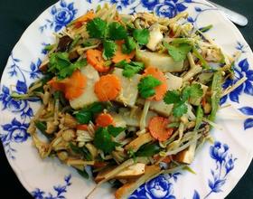 先用姜油炒红萝卜。依序放菇类再放青叶类。