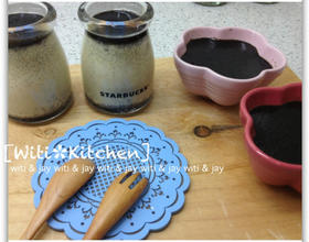 - 3. 黑芝麻淋酱将芝麻粉与细砂糖拌匀,与植物油拌匀,再加入冷开水拌匀(浓稠度可以洗好斟酌加入),加盖微波20~30秒,拌匀,倒入步骤2蒸煮好的布丁上,待透凉,即可加盖冰冰箱。