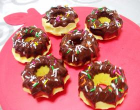 然后将完成的甜甜圈沾上巧克力酱并洒上彩色巧克力即可~ - 4. 待巧克力冷确固定就是美味好吃的巧克力甜甜圈了~