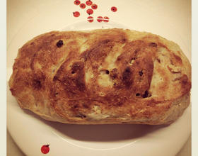 - 7. 取出面团加入提子干及合桃,拌匀后返转放在焗盘上,进行最后一次发酵,约45分钟发至2倍就可以入炉