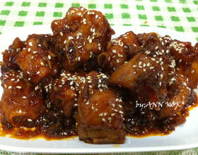 - 4. 将锅里多馀的油分盛起留下少许在锅内,爆香蒜蓉再倒入已经调好的调味料煮滚,加入炸好的排骨,小火煮至收汁即可~