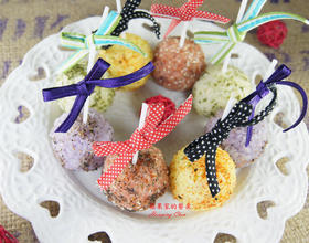 - 6. 再将採米团均匀的沾上辛香料,并且插上塑胶棒即可完成彩米棒棒糖,再绑个蝴蝶结....更是加分美丽上桌啰^^~