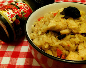 - 8. 将步骤4的鸡胸肉舖上去。放进电子锅里,选择「什锦饭」功能,按下煮饭键。