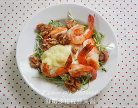 - 9. 组合:芽菜、奶油乳酪酱、核桃、鲜虾最后淋上苹果酱,漂亮完成。