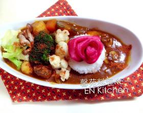 - 3. 饭先盛上、再把汆烫蔬菜摆上、淋上咖喱汁最后撒上咖喱香粉(ガラムマサラgarammasala)