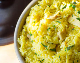 - 4. 将番红花鸡汤加入3的米锅内,大火煮滚,加入盐与胡椒调味。