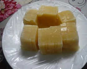 - 3. 取一浅盘,表面包上一层保鲜膜。这是预防冻豆腐沾黏在盘子上用的,一定要加,不然届时取不下来就麻烦了。