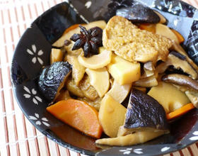 泡好的干香菇洗净皱褶内的脏污后一切四、烤麸对角切二、八角沖一下水备用