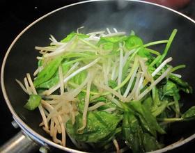 油入锅,热时加入菠菜炒一下再加入豆芽一起炒一炒(这两样菜很容易炒,所以不必炒太久)。加入料酒,再加入盐,鸡精,滴上香油再炒一下就可拿起。撒上干红葱头挺香的。