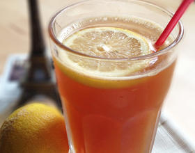 成品杯内放入刚刚切好的柠檬圆片一片.将刚刚雪克杯摇制的饮料倒入成品杯内即完成
