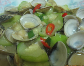 - 3. 倒入鲜蛤,稍稍炒一下,盖上锅盖,不一会儿,就会听到鲜蛤像爆米花一样,啵啵啵,发出爆开的美妙声音!这时打开锅盖会发现,丝瓜已经出了一些汤汁,加上鲜蛤的汤汁,此时放入葱花稍稍一炒即可。最后用太白水勾一个薄薄的芡,就可以起锅了!注意丝瓜不能煮太久,否则水分都出来了以后,就不好吃了,一定要注意拌炒的时间。