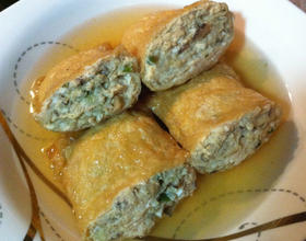 将油豆腐袋洗净、微波30秒后取出