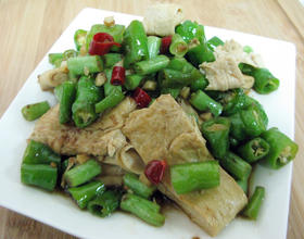 下豆皮前加一些水,煮开后下豆皮煮至入味收汁