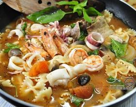 - 6. 加入墨鱼,虾仁,牛肉,鲔鱼片煮滚后试咸味,依个人喜爱调整,放入蝴蝶面加入九层塔提香!