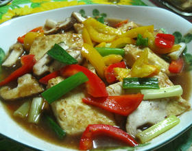 鸡蛋豆腐切片后入锅煎至金黄后 再加点油 放红葱片在旁爆香 (先入香菇片)再入蚝油 沙茶酱 出香味后加水(加红黄椒段)