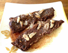 生牛肉加黑胡椒粒、蒜片、刷上橄榄油腌15分钟