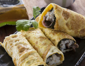 用蛋皮包裹在海苔卷外层。