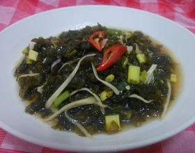 冰镇后的地衣加入少许白醋、盐、白胡椒粉、香油与适量的酱油膏(或是香菇素蚝油),搅拌均匀后就可以盛盘上桌。