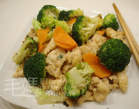 - 6. 倒入鸡胸肉片, 加盐, 胡椒调味, 一起拌炒一下即可装盘上桌