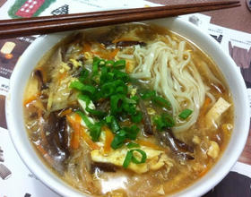 想吃面就是另锅滚水加盐煮面条,也可以煮水饺变成酸辣汤饺。若是要当主食的酸辣汤,可以将食材都切大一点,以热水煮汤。(冷水煮汤是汤头较香好喝,热水煮汤是食材保留原味)酸辣汤的材料可以自由搭配自己喜欢的食材,有5种颜色最好看,也可以加笋丝或香菇或鸭(猪)血,想吃肉可加肉丝,肉丝是和红萝卜一起炒,只要翻炒材料时顺序对了就好,愈容易熟的愈晚放。