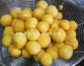 - 3. 锅内热油,约摄氏100度,将材料放入油锅内慢慢炸至浮起后,用漏杓往下压炸至金黄色,捞起沥油即成。(边炸边滚动让地瓜球平均受热)