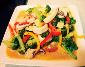 再放入黄红叔及花椰菜 ,再放入李锦记的葡时蔬酱 加点水