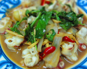 起油锅,将准备好的【材料1】全数倒入炒至洋葱稍微透明,将鱿鱼倒入快炒呛酒,待颜色变白调味,起锅前放入九层塔拌炒几下即可。