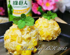 [准备]马铃薯蒸熟压成泥,加入调味料及鲜奶拌匀,另取一容器,加入玉米粒、美奶滋及面包粉拌匀成[玉米酱]备用。
