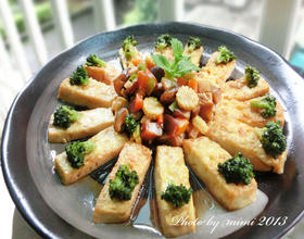 鸡蛋豆腐切成薄条状,入油锅煎成两面金黄。