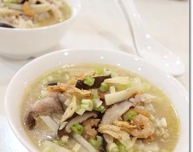 - 1. 绿 竹 笋 用 中 火 煮 30 分 钟,去 壳 切 丝。香 菇 泡 软 切 丝,虾 米 泡 软,芹 菜 切 末,肉 丝 用 腌 料 腌 30 分 钟,白 米 洗 净。